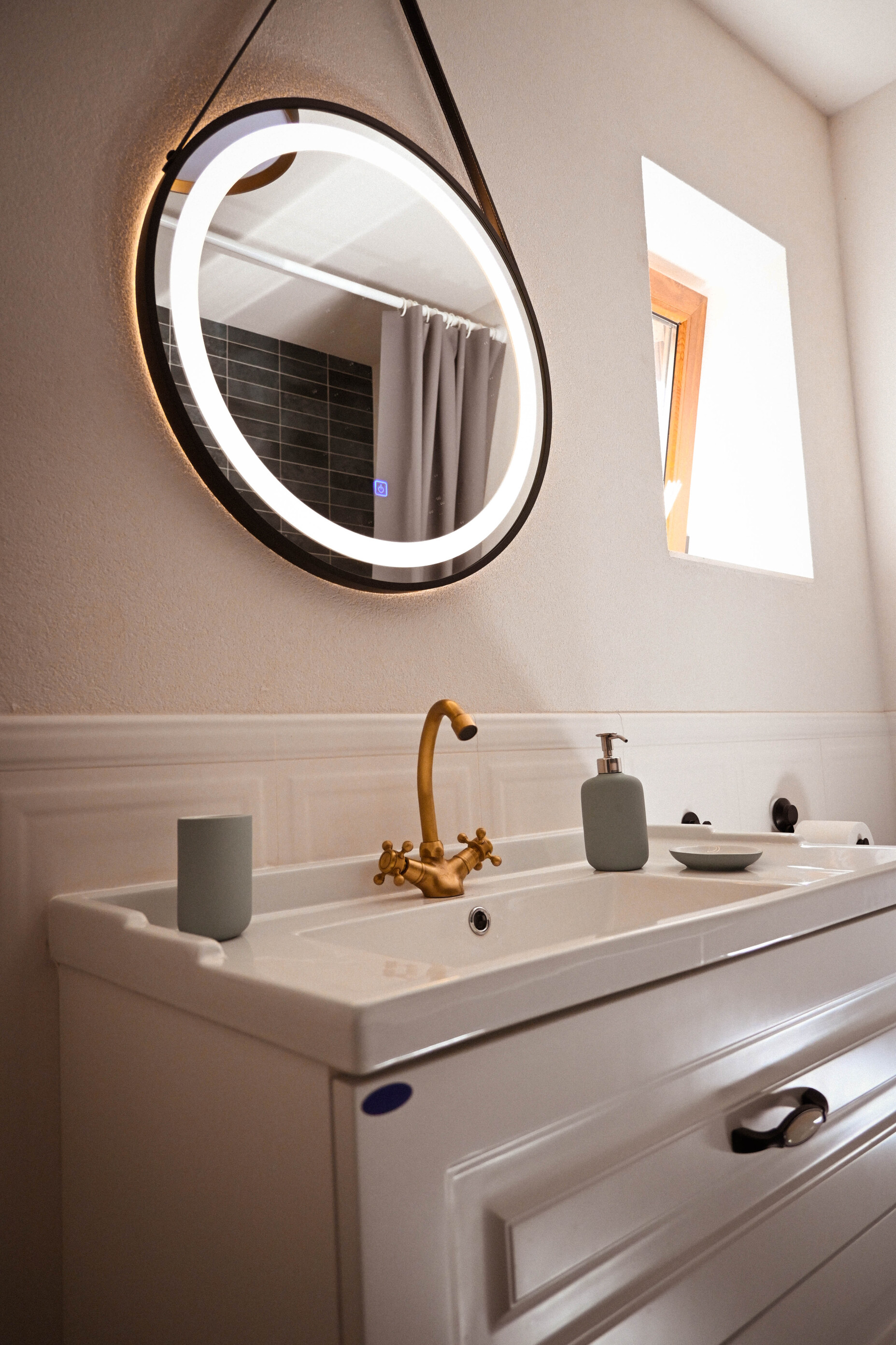 Stylish bathroom blending classic elegance with modern comfort. Features a freestanding bathtub with gold fixtures, a sleek vanity with a gold faucet, and a toilet with ambient lighting. The space is enhanced by patterned tiles, soft natural light, and refined decorative touches — offering a luxurious and relaxing experience.