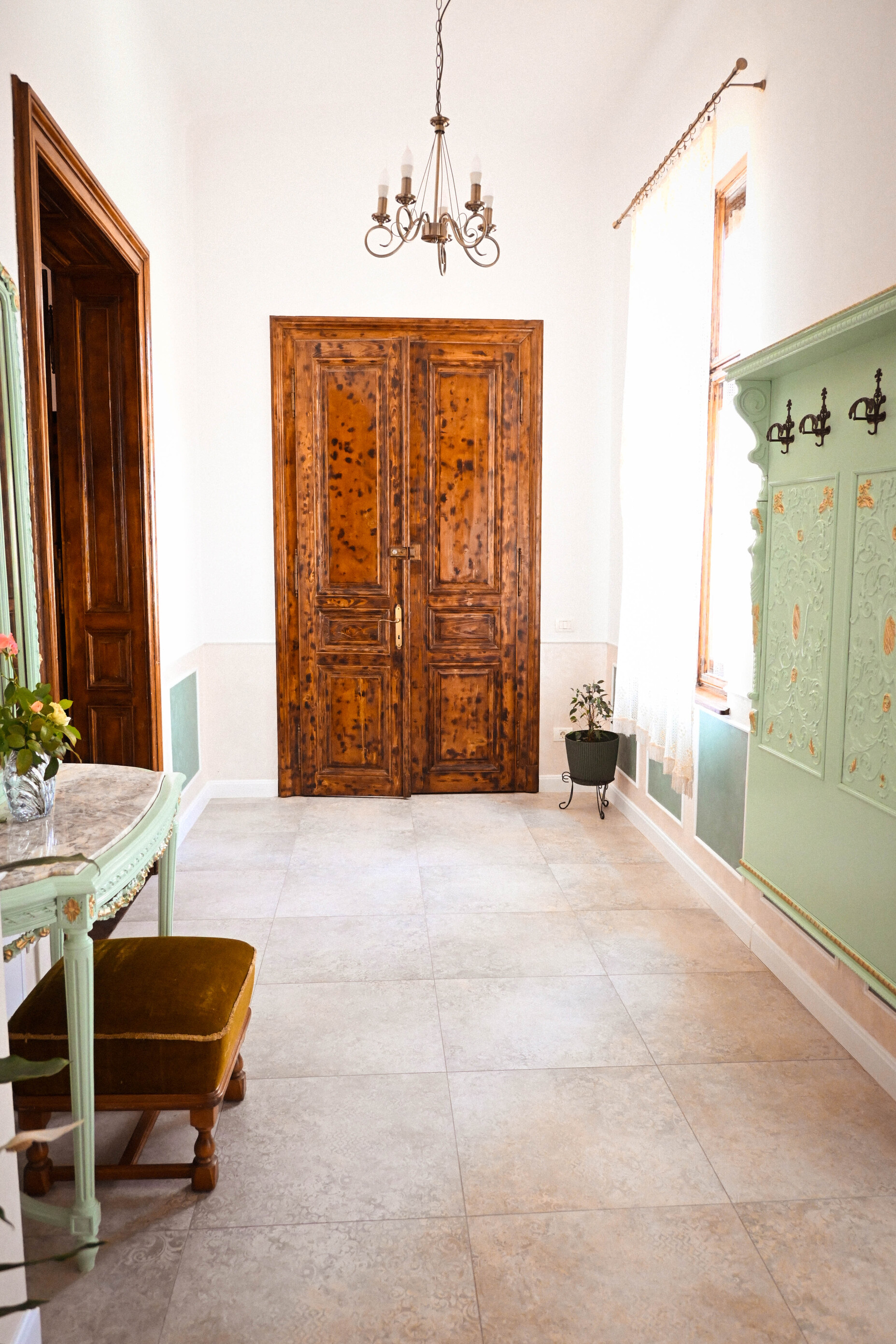 Charming private courtyard — your peaceful outdoor retreat. This intimate space features a mosaic-tiled bistro table with elegant wrought iron chairs, surrounded by lush potted plants and warm cream-toned walls. Whether enjoying morning coffee or evening wine, the courtyard offers a tranquil escape with natural light, tasteful decor, and a welcoming ambiance.